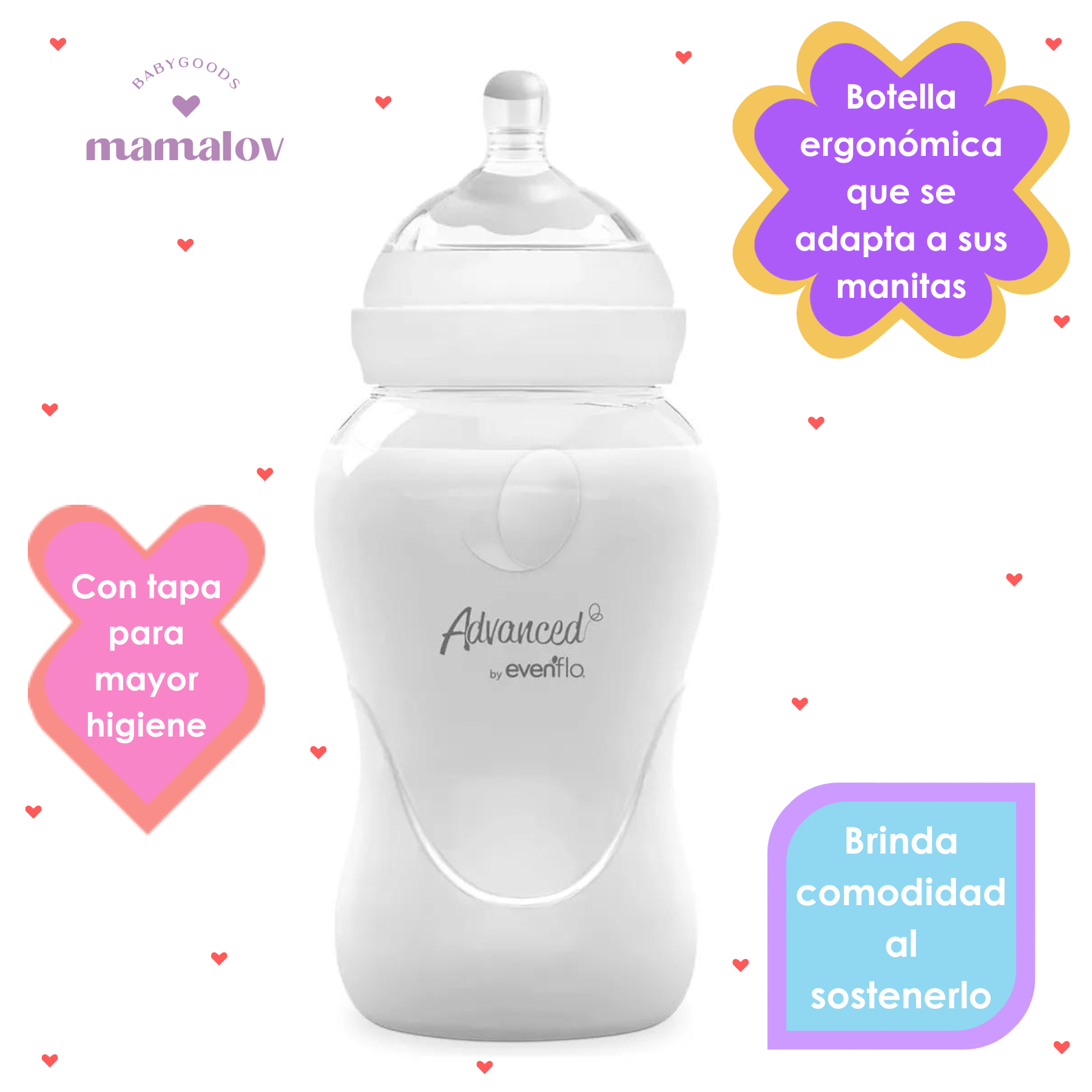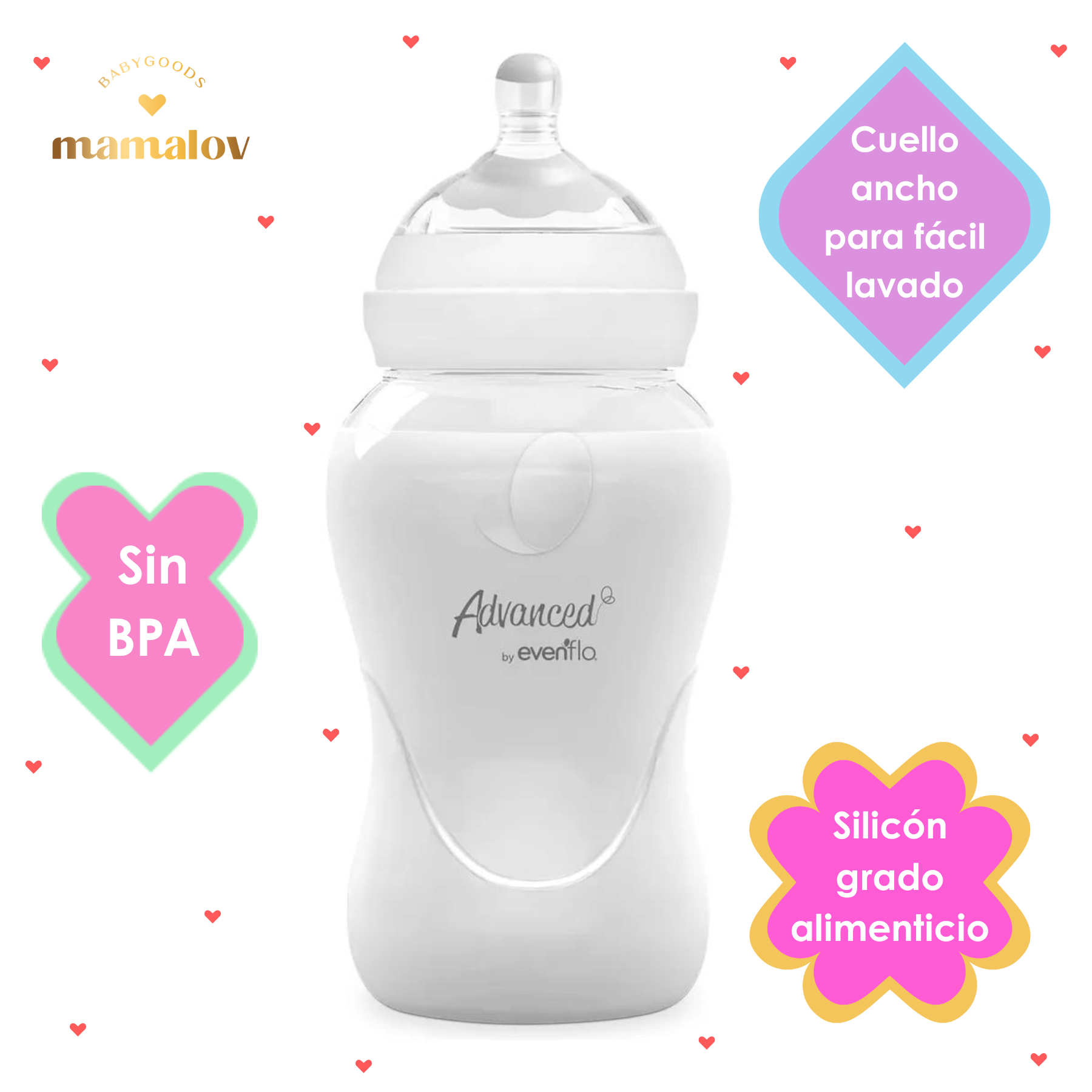 Los Biberones Advanced by Evenflo cuentan con tecnología de doble válvula anticólicos con control de canales de distribución que regula la presión del aire al interior del biberón y permite un flujo constante y natural, ayudando a reducir los cólicos, gases y el reflujo.
