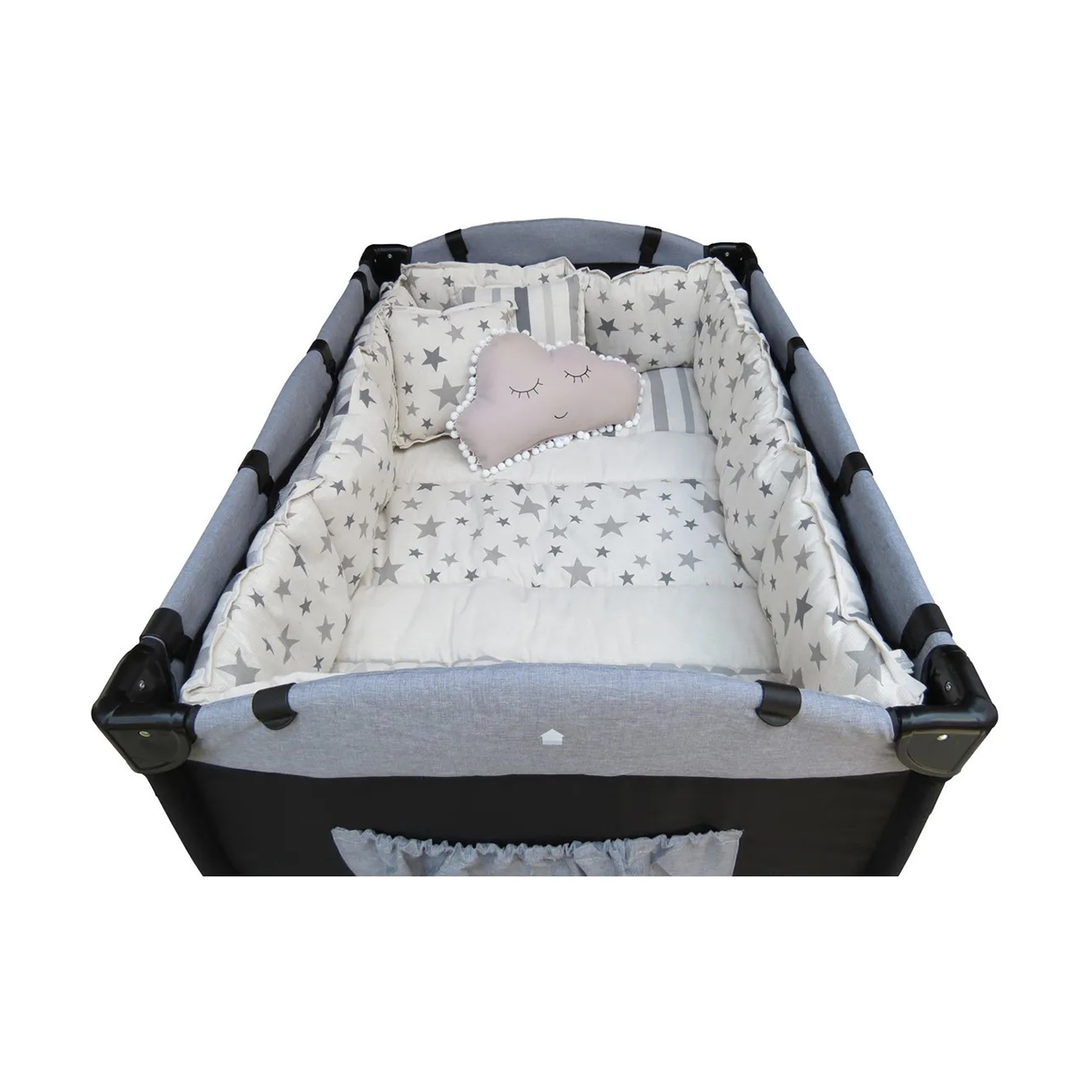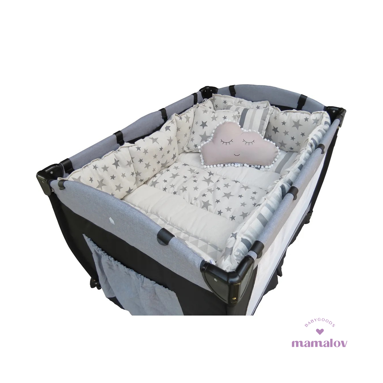 El encantador edredón “Harper” con base en color arena y distintos estampados en gris cuenta con un diseño combinado a tres patrones: estrellas, rayas y triángulos. Viene acompañado de 2 lindos cojines a juego, uno de estrellas y otro de rayas, además se agrega 1 tierno cojín decorativo en forma de nube con contorno de suaves pompones.