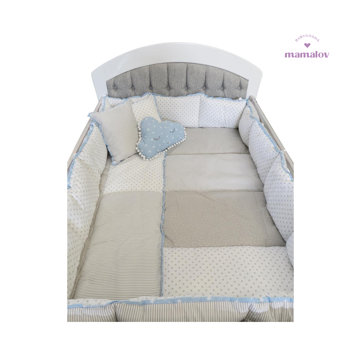 El encantador edredón “Karlota Azul” con medidas ideales para Cama-Cuna está hecho con base en blanco y distintos estampados en gris cuenta con un diseño combinado a tres patrones: diferentes puntos y rayas.