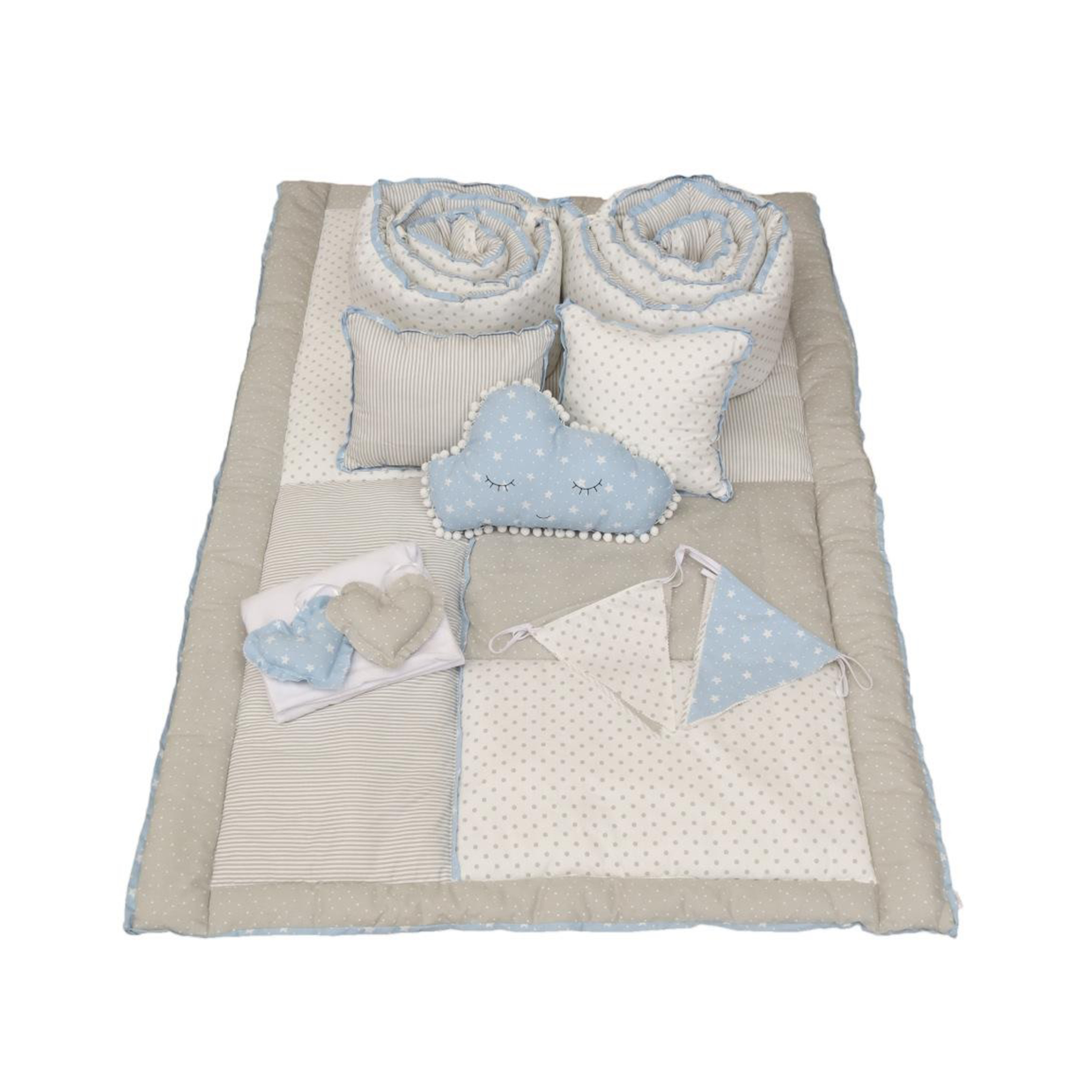 Viene acompañado de 1 fresca sábana de cajón y 2 lindos cojines a juego, uno de puntos y otro a rayas, tanto el edredón como los cojines están rodeados por un filillo color azul, además se agrega 1 tierno cojín decorativo azul con estrellas blancos en forma de nube con contorno de suaves pompones.
