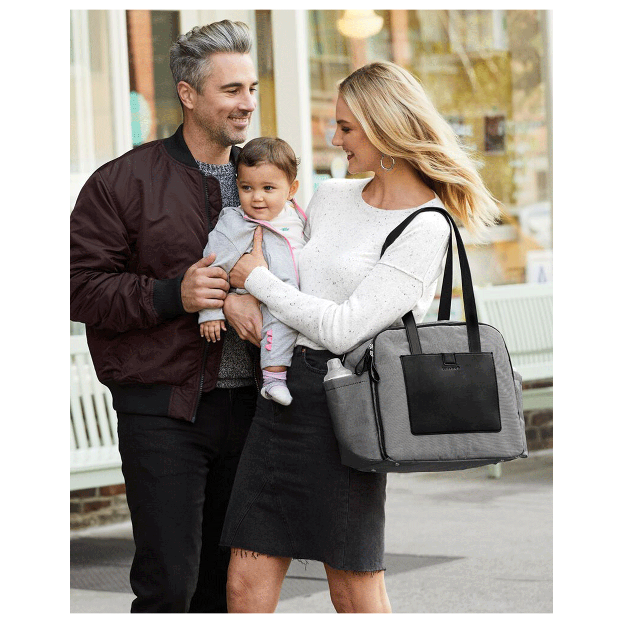Moderno y funcional, la bolsa de pañales espaciosa está acentuada con un bolsillo de cuero vegano que resalta las líneas limpias de la bolsa. Un gran compartimento principal se abre para un fácil acceso y las cremalleras se cierran de forma segura. Los artículos básicos de la bolsa de pañales se guardan perfectamente en el bolsillo trasero con cremallera para que estén listos para usar. Los mangos sobre el hombro ofrecen la facilidad de manos libres (para que mamá también pueda llevar a su pequeño). Hecho a mano en un tejido con textura elegante y deportivo, es una apariencia que se desplaza del trabajo al fin de semana en un estilo aerodinámico característico. Estilo # 816523026362. El compartimento principal para bolsas de pañales con cierre de cremallera bidireccional y una amplia "apertura de puente levadizo". 10 bolsillos para lo esencial de la bolsa de pañales, incluido un bolsillo frontal de fácil acceso con cierre magnético y dos bolsillos laterales aislados para botellas. El bolsillo trasero con cremallera es ideal para cambiar los pañales. Un bolsillo interior con cremallera y dos bolsillos elásticos. Manijas dobles sobre el hombro con envoltura de asa segura (caída de aproximadamente 12 pulgadas). Cuerpo de tejido resistente al agua con detalles de piel vegana. Incluye almohadilla de cambio acolchada y lavable a máquina; Tamaño desplegado (pulgadas): 23.5lx 12h; (cm): 60l x 30h; plegado (pulgadas): 8l x 12h (cm): 20l x 30h